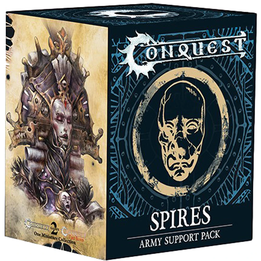 This Spires Army Support Pack set includes new Command Cards, Secret Objective Cards as well as all new, individually illustrated, Spell and Incantation Cards as available to the casters of each faction to serve as memory aids, plus special The Last Argument of Kings and First Blood Scenario cards uniquely used in each game play style. All of these cards are contained within a beautifully illustrated Spires themed deck box to allow players to keep all of the cards needed to play Conquest in a single, easy-to-access container.
