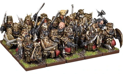 The line infantry of the temple-cities are the Blacksouls. They favour heavy axes and swords, marching to war in tight regiments and bearing ensorcelled dark iron shields. Although the Abyssal Dwarfs are usually fractious, each warrior in the ranks works as part of the group, for these sadists understand that this is the most effective way to make the enemy suffer.